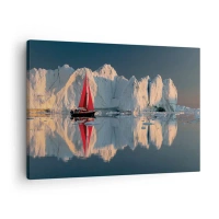Obraz na płótnie - Żaglówka z czerwonym żaglem na tle lodowca - 70x50cm - Na krańcu świata - Nowoczesna dekoracja ścienna do salonu i sypialni ARTTOR