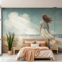 Fototapeta Premium Sand - Kobieta w białej sukience spacerująca po plaży - 100x70cm - Na spotkanie słońca i wiatru - Nowoczesna dekoracja ścienna do salonu, kuchni i sypialni ARTTOR