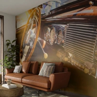 Fototapeta Premium Sand - Wnętrze klasycznego samochodu z drewnianym wykończeniem - 100x70cm - Powiew luksusu z przeszłości - Nowoczesna dekoracja ścienna do salonu, kuchni i sypialni ARTTOR