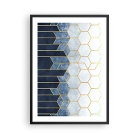 Plakat w czarnej ramie - Geometryczna kompozycja w odcieniach granatu i złota z heksagonami - 50x70cm - Kompozycja w synkopowym rytmie - Nowoczesna dekoracja ścienna do salonu i sypialni ARTTOR