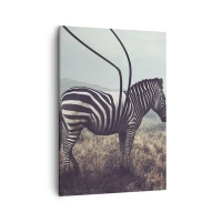 Obraz na płótnie - Surrealistyczna zebra z wydłużonymi czarnymi pasami na tle sawanny - 50x70cm - Uwaga! Usterka - Nowoczesna dekoracja ścienna do salonu, kuchni i sypialni ARTTOR