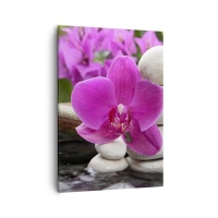 Obraz na płótnie - Różowa orchidea na kamieniach z wodnym odbiciem - 50x70cm - Już odpoczywasz - Nowoczesna dekoracja ścienna do salonu, kuchni i sypialni ARTTOR