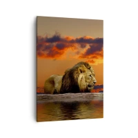 Obraz na płótnie - Lew przy wodzie na tle pomarańczowego nieba - 50x70cm - Król natury - Nowoczesna dekoracja ścienna do salonu, kuchni i sypialni ARTTOR