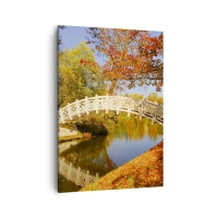 Obraz na płótnie - Biały mostek nad rzeką w jesiennym krajobrazie - 50x70cm - Na białym mostku westchnień - Nowoczesna dekoracja ścienna do salonu, kuchni i sypialni ARTTOR