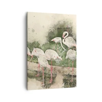 Obraz na płótnie - Stado flamingów w otoczeniu zieleni i wody - 50x70cm - Egzotyczny sen - Nowoczesna dekoracja ścienna do salonu, kuchni i sypialni ARTTOR