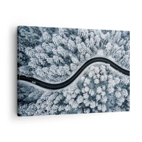 Obraz na płótnie - Zakręcona droga w zimowym lesie z lotu ptaka - 70x50cm - Przez zimowy las - Nowoczesna dekoracja ścienna do salonu i sypialni ARTTOR