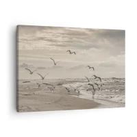 Obraz na płótnie - Mewa w locie nad nadmorskim krajobrazem - 70x50cm - Morza szum, ptaków śpiew - Nowoczesna dekoracja ścienna do salonu i sypialni ARTTOR