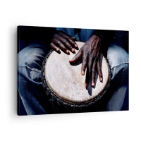Obraz na płótnie - Ręce grające na bębnie djembe w dynamicznej kompozycji - 70x50cm - Żyj w swoim rytmie - Nowoczesna dekoracja ścienna do salonu i sypialni ARTTOR