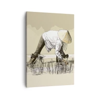 Obraz na płótnie - Ilustracja pracującego rolnika w polu ryżowym - 50x70cm - Udanych zbiorów - Nowoczesna dekoracja ścienna do salonu, kuchni i sypialni ARTTOR