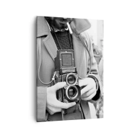 Obraz na płótnie - Mężczyzna trzymający aparat vintage w czarno-białej tonacji - 50x70cm - W stylu retro - Nowoczesna dekoracja ścienna do salonu, kuchni i sypialni ARTTOR