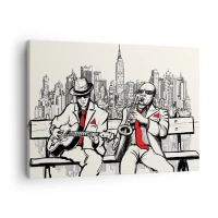 Obraz na płótnie - Jazzowy duet z saksofonem i gitarą na tle miasta - 70x50cm - Nowojorska improwizacja - Nowoczesna dekoracja ścienna do salonu i sypialni ARTTOR