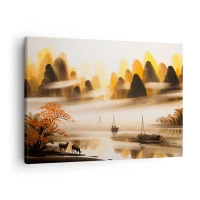 Obraz na płótnie - Orientalny krajobraz z rzeką, górami i delikatną mgłą - 70x50cm - Dalej niż na Dalekim Wschodzie - Nowoczesna dekoracja ścienna do salonu i sypialni ARTTOR
