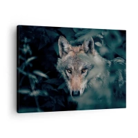 Obraz na płótnie - Wilk w naturalnym otoczeniu, spoglądający z głębi lasu - 70x50cm - Łowca - Nowoczesna dekoracja ścienna do salonu i sypialni ARTTOR