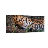 Obraz na szkle - Lampart pośród tropikalnych liści na ciemnym tle - 50x70cm - Gospodarz w dżungli - Nowoczesna dekoracja ścienna do salonu, kuchni i sypialni ARTTOR