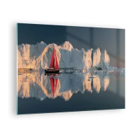 Obraz na szkle - Żaglówka z czerwonym żaglem przy górach lodowych o zachodzie - 70x50cm - Na krańcu świata - Nowoczesna dekoracja ścienna do salonu i sypialni ARTTOR