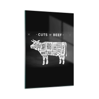 Obraz na szkle - Schemat cięć mięsa wołowego na czarnej tablicy - 50x70cm - Elementarz masarza - Nowoczesna dekoracja ścienna do salonu, kuchni i sypialni ARTTOR