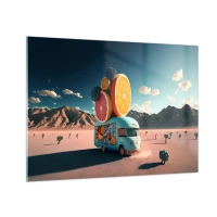 Obraz na szkle - Turkusowy kamper z owocami na tle pustynnego krajobrazu - 70x50cm - Smak wakacji - Nowoczesna dekoracja ścienna do salonu i sypialni ARTTOR
