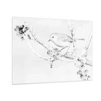 Obraz na szkle - Ptak siedzący na gałęzi w zimowej, monochromatycznej scenerii - 70x50cm - Zimowy poranek - Nowoczesna dekoracja ścienna do salonu i sypialni ARTTOR