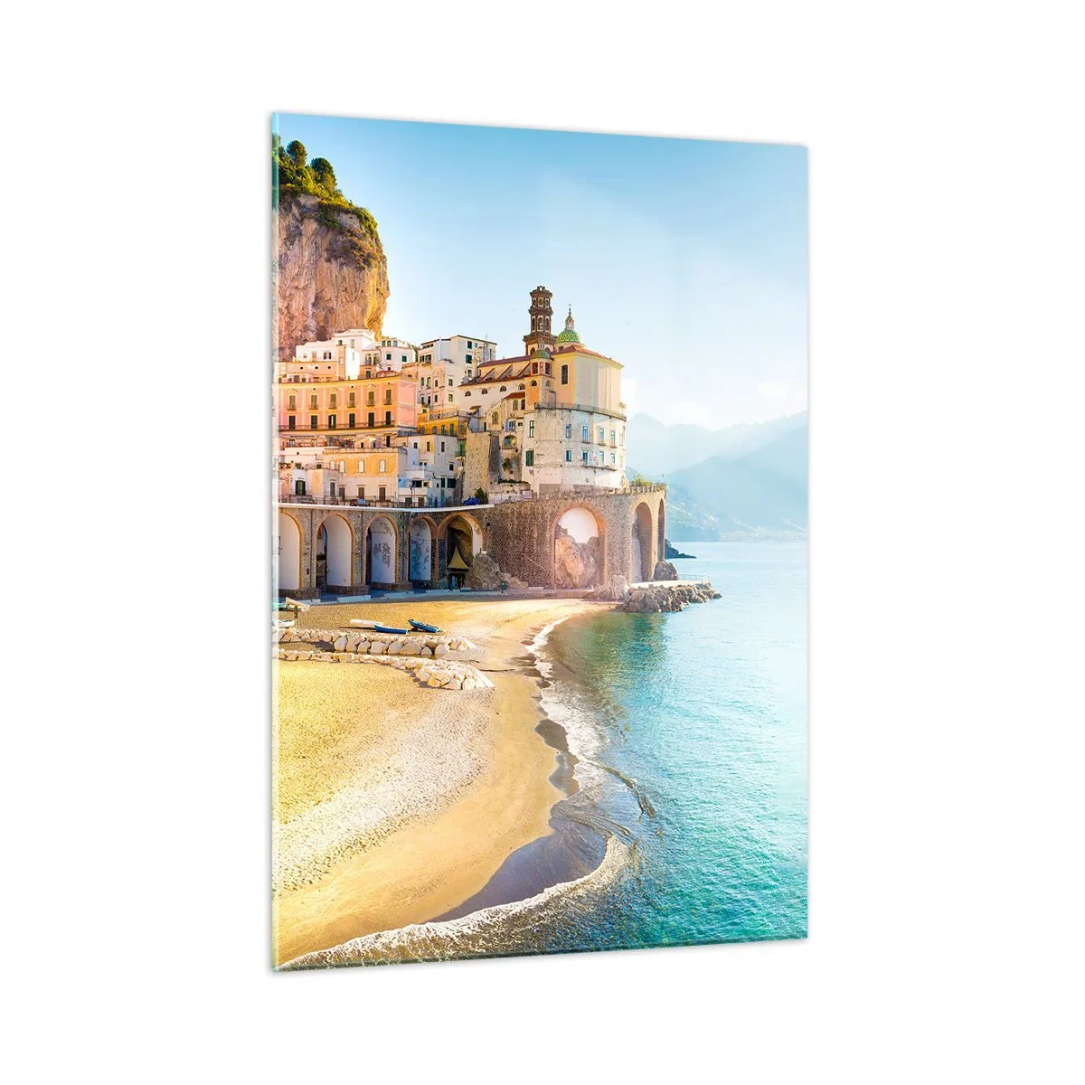 Obraz na szkle - Akwamarynowa zatoka z łodziami i zabudową na klifie - 50x70cm - Pejzaż w lazurze - Nowoczesna dekoracja ścienna do salonu, kuchni i sypialni ARTTOR