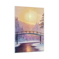 Obraz na szkle - Zimowy krajobraz z mostkiem nad rzeką o zachodzie słońca - 50x70cm - Cztery pory roku - zima - Nowoczesna dekoracja ścienna do salonu, kuchni i sypialni ARTTOR
