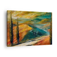 Obraz na płótnie - Toskański krajobraz z polami, drogą i cyprysami - 70x50cm - Toskański pejzaż - Nowoczesna dekoracja ścienna do salonu i sypialni ARTTOR