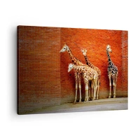 Obraz na płótnie - Cztery żyrafy na tle ceglanej ściany w artystycznej scenerii - 70x50cm - Widzicie jakąś akację? - Nowoczesna dekoracja ścienna do salonu i sypialni ARTTOR