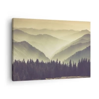 Obraz na płótnie - Malownicze pasma górskie otulone mgłą w ciepłym świetle - 70x50cm - Za siedmioma górami… - Nowoczesna dekoracja ścienna do salonu i sypialni ARTTOR