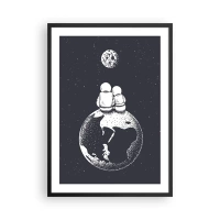 Plakat w czarnej ramie - Astronauci siedzący na Ziemi i patrzący na Księżyc - 50x70cm - Kosmiczne love story - Nowoczesna dekoracja ścienna do salonu i sypialni ARTTOR