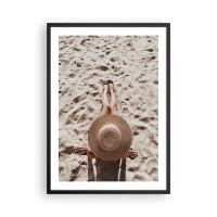 Plakat w czarnej ramie - Osoba opalająca się na plaży, widok z góry z dużym kapeluszem na tle piasku - 50x70cm - Wymarzony czas - Nowoczesna dekoracja ścienna do salonu i sypialni ARTTOR