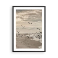 Plakat w czarnej ramie - Mewy unoszące się nad brzegiem morza przy pochmurnym niebie - 50x70cm - Morza szum, ptaków śpiew - Nowoczesna dekoracja ścienna do salonu i sypialni ARTTOR
