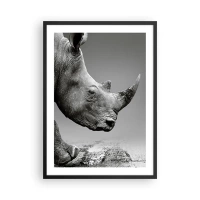 Plakat w czarnej ramie - Czarno-białe zbliżenie głowy nosorożca - 50x70cm - Niepowstrzymana siła - Nowoczesna dekoracja ścienna do salonu i sypialni ARTTOR