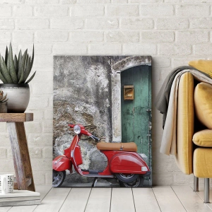 - Obraz przedstawia czerwony skuter zaparkowany przed zielonymi, postarzałymi drzwiami otoczonymi roślinami. Motyw ten wprowadza retro klimat i urok włoskiej uliczki, idealnie wpisując się w stylowe wnętrza.