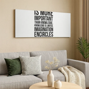 Obraz na płótnie "Inspirujący cytat na białym tle w czarnej czcionce" to idealna dekoracja dla miłośników minimalizmu i motywacyjnych akcentów. Centralnym elementem jest wyrazisty cytat w czarnej czcionce, który wyróżnia się na prostym, białym tle. Cytat "Imagination is more important than knowledge. Knowledge is limited. Imagination encircles the world" autorstwa Alberta Einsteina inspiruje do kreatywnego myślenia i działania.