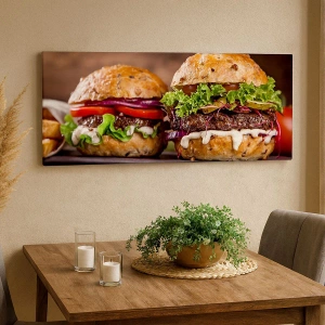 - Obraz przedstawiający apetyczne burgery z warzywami i sosem na rustykalnym tle. Idealny dla miłośników kulinariów, wprowadzając smakowitą atmosferę do kuchni lub jadalni.