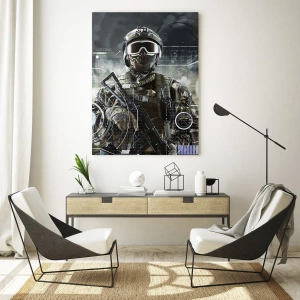 Zainwestuj w unikalną dekorację, która stanie się centralnym punktem Twojego wnętrza. Obraz na szkle z żołnierzem w futurystycznym stylu to połączenie nowoczesności, sztuki i funkcjonalności, które zachwyci każdego miłośnika militarnych i technologicznych motywów.