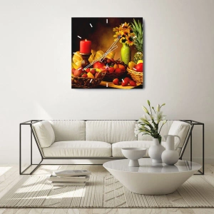 Zegar ścienny - Kosz z owocami, chlebem i słonecznikami na stole - 30x30cm - Martwa natura z pieczywem i owocami - Nowoczesna dekoracja ścienna do salonu, kuchni i sypialni ARTTOR