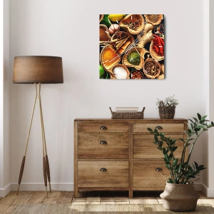 Motyw przypraw symbolizuje bogactwo aromatów i różnorodność smaków, podkreślając ich znaczenie w sztuce kulinarnej. Naturalne składniki, jak imbir, cynamon czy pieprz, dodają obrazowi autentyczności i ciepła, idealnie wpisując się w kuchenny klimat.