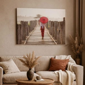 Obraz na płótnie - Kobieta z czerwonym parasolem na drewnianym moście - 50x70cm - Na starym moście - Nowoczesna dekoracja ścienna do salonu, kuchni i sypialni ARTTOR
