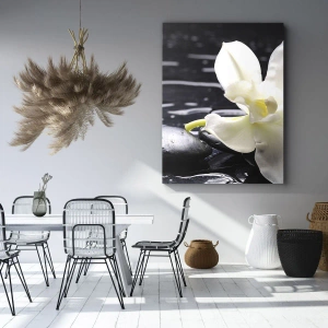 Biała orchidea na tle czarnych kamieni i wody to doskonała propozycja dekoracyjna do nowoczesnych i eleganckich wnętrz. Ten obraz na płótnie tworzy atmosferę spokoju i harmonii, dodając pomieszczeniom wyjątkowego stylu i klasy.