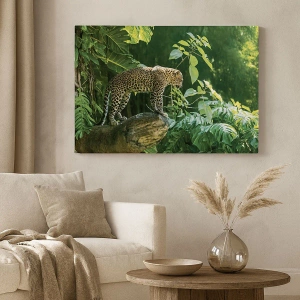 - Obraz na płótnie o wymiarach 70x50 cm przedstawia lamparta stojącego na skale pośród tropikalnej roślinności. Doskonała dekoracja dla miłośników egzotycznej natury i dzikiego piękna, która wprowadza wyrazisty akcent do wnętrz.