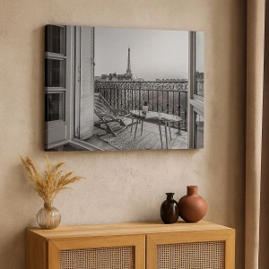 - Czarno-biały obraz przedstawiający widok na wieżę Eiffla z eleganckiego balkonu. Na balkonie znajdują się leżaki, stolik z książką i filiżanką, co tworzy wyjątkową atmosferę. Idealny do nowoczesnych i klasycznych wnętrz.