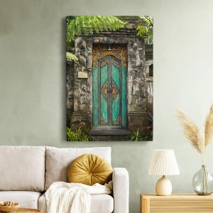 - Urokliwe dekoracyjne drzwi otoczone bujną tropikalną roślinnością. Egzotyczny klimat i misternie zdobiona architektura wprowadzają do wnętrza niezwykłą harmonię i styl boho. Idealny obraz do salonu lub sypialni.