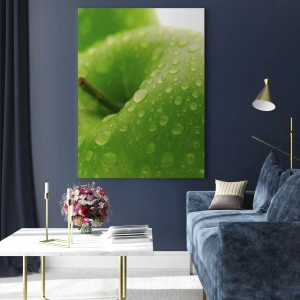 - Artystyczne ujęcie zielonego jabłka z kroplami wody, symbolizujące świeżość, zdrowie i naturalne piękno, idealne do dekoracji kuchni.