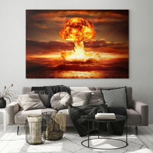 • Obraz przedstawia dramatyczną eksplozję grzyba atomowego na tle zachodu słońca, tworząc mocny i wyrazisty akcent dekoracyjny.