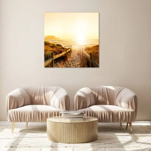 Obraz na szkle - Ścieżka przez wydmę prowadząca na plażę o zachodzie słońca - 70x50cm - Przez wydmę, w stronę słońca - Nowoczesna dekoracja ścienna do salonu i sypialni ARTTOR