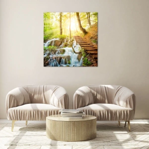 - Obraz przedstawia leśny wodospad z drewnianą ścieżką oświetloną promieniami słońca. Naturalna kompozycja i harmonia barw wprowadzają spokój i inspirację do wnętrz.