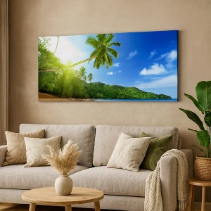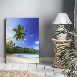 Motyw tropikalnej plaży symbolizuje wolność, relaks i bliskość z naturą, co czyni ten obraz idealnym wyborem dla osób ceniących piękno egzotycznych krajobrazów oraz subtelne dekoracje wnętrz. To również doskonały pomysł na prezent dla miłośników podróży i letnich klimatów.