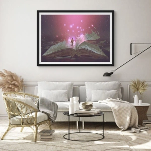 Plakat w czarnej ramie - Postać wchodząca na otwartą książkę w magicznym świetle - 70x50cm - Zaproszenie do innego świata - przeczytaj! - Nowoczesna dekoracja ścienna do salonu i sypialni ARTTOR