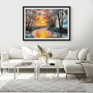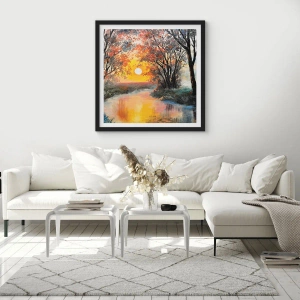 Plakat w czarnej ramie - Zachód słońca nad rzeką w jesiennym krajobrazie - 70x50cm - Jesienne klimaty - Nowoczesna dekoracja ścienna do salonu i sypialni ARTTOR