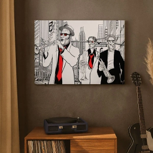 Centralnym punktem obrazu są muzycy, których postacie zostały przedstawione w graficznym, stylizowanym stylu. Ich eleganckie stroje, charakterystyczne instrumenty i czerwone detale, takie jak krawaty i okulary, nadają kompozycji wyrazistości i charakteru. Miejska sceneria w tle, pełna detali, podkreśla dynamikę i kreatywny charakter dzieła.